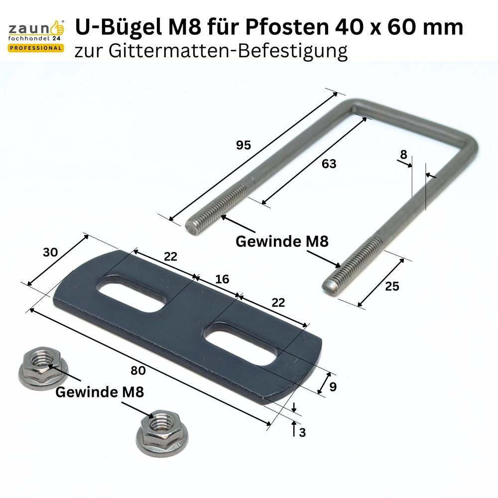 Mit den extra stabilen M8 U-Bügeln für Zaunpfosten 60x40mm können (Doppelstab-)Zaunelemente an ungebohrten Pfosten mit dem Querschnitt 60x40mm befestigt werden.