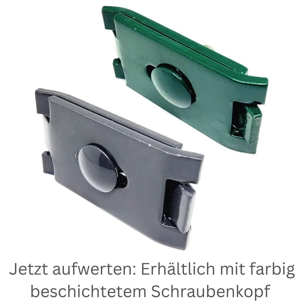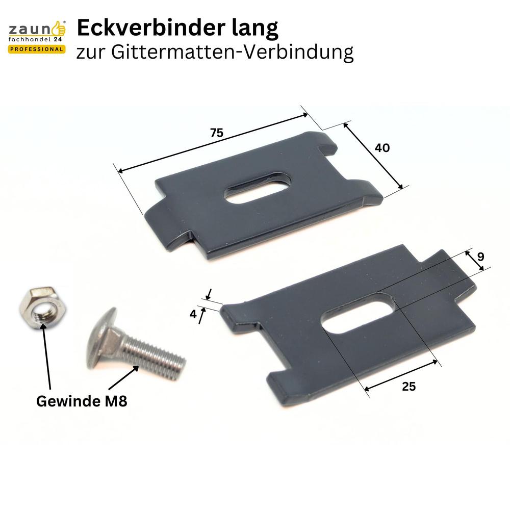 Der stabile lange Eckverbinder ist erhältlich in feuerverzinkt oder verzinkt und pulverbeschichtet in Zaunfarbe Anthrazit oder Grün