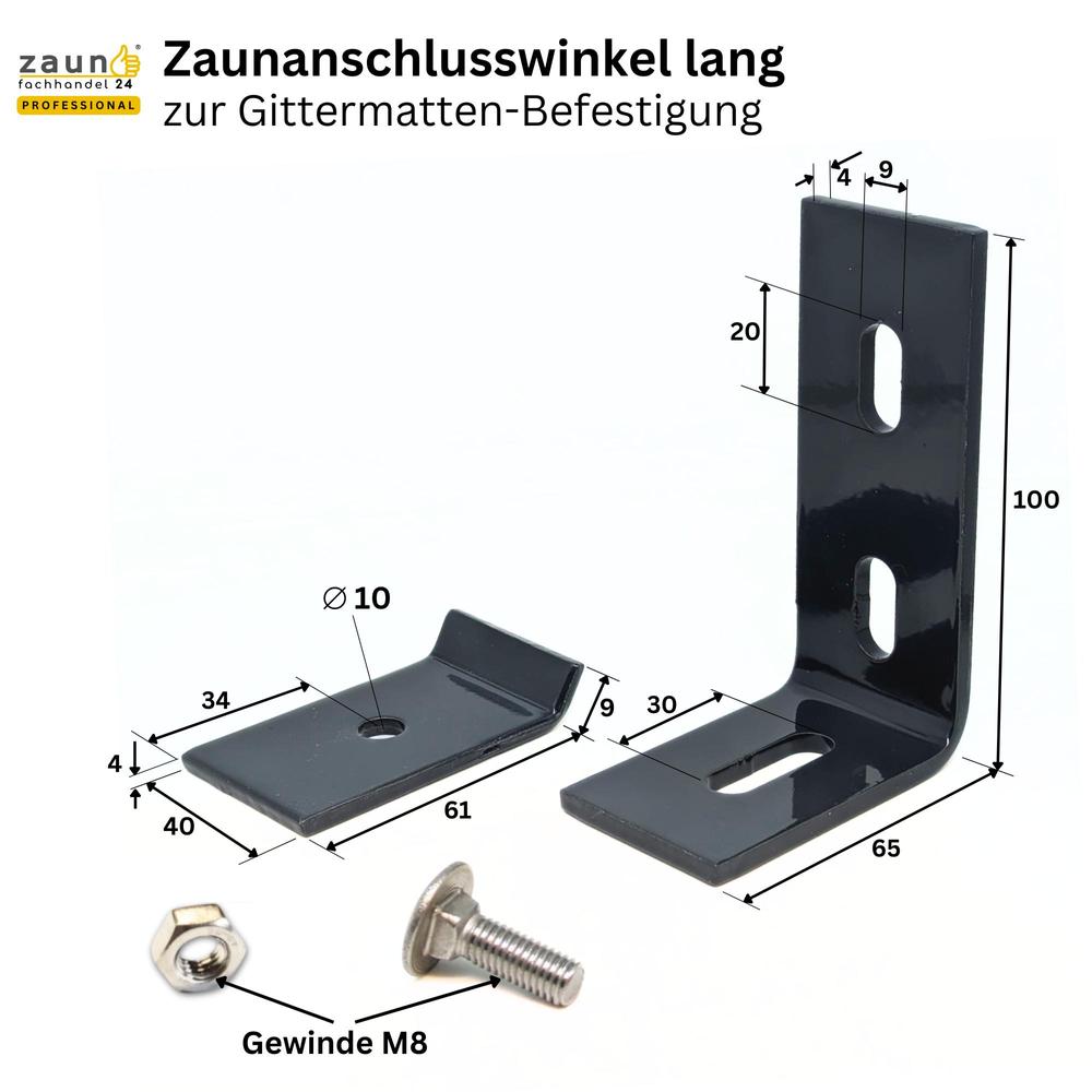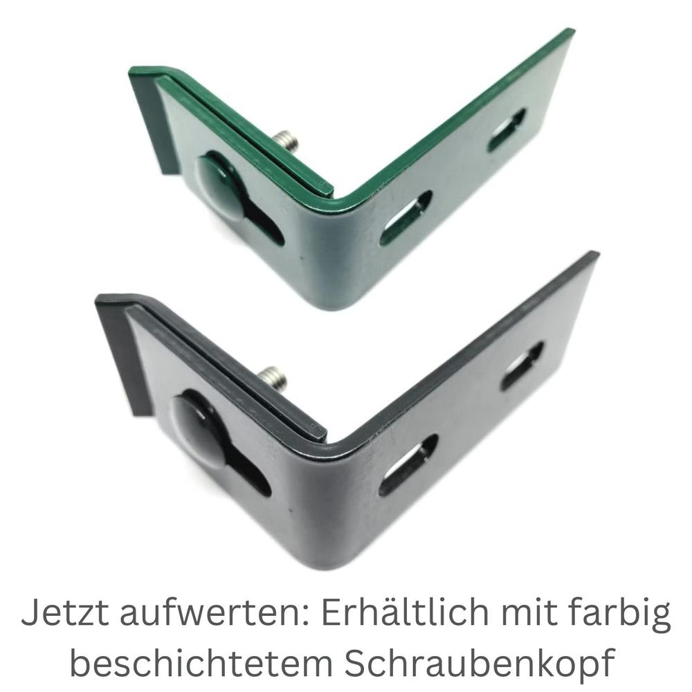 Beim Zaunbau mit Doppelstabmatten kann es vorkommen, dass man die Zaunelemente beispielsweise an einer Hauswand befestigen muss, um eine mögliche Lücke zu schließen. Die Befestigung der Doppelstegmatten mit dem Zaunanschlusswinkel ist durch die Langlöcher im Winkel kein Problem. Der Winkel wird einfach mit den jeweilig benötigten Schrauben an der Wand verschraubt. Anschließend kann die Doppelstabmatte am Winkel mit der Konterplatte und der mitgelieferten Schraube mit Mutter befestigt werden. Nach der Montage sitzt die Doppelstabmatte durch die robuste Bauweise des Zaunanschluss Winkels fest und sicher. Lücken zwischen Gartenzaun und Hauswand werden so schnell, einfach und sicher geschlossen, sodass das Kind oder der Hund nicht mehr durch den Zaun ausbüchsen kann.